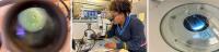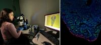 Left: Killifish embryos as seen through a microscope. Killifish age faster than any other vertebrate, and these embryos will be mature fish in just a few weeks. Middle: Nastasia Nelson, who works in the Pearson and Kizil labs, examines tissue from the brain of a killifish. Right: A section of killifish brain tissue mounted on a slide.