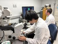 Yosuke Sakamoto (left), a postdoctoral fellow in the Farber lab, is a surgeon who obtains human samples for studies of immune cells in tissues. Joshua Gray, another postdoctoral fellow, is looking at an image of lymphocytes from the lungs of a human tissue donor. Photo credit: Farber lab, Columbia University Irving Medical Center