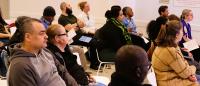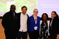 From left: Olajide Williams, Felipe Castillo, Caroline Arout, Sandra Harris, and Katherine Diaz at the community research forum.