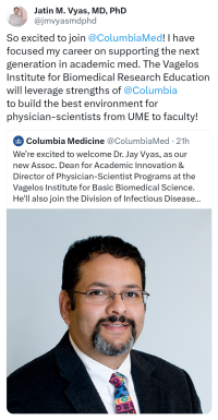 We’re excited to welcome Dr. Jay Vyas, as our new Assoc. Dean for Academic Innovation & Director of Physician-Scientist Programs at the Vagelos Institute for Basic Biomedical Science. He'll also join the Division of Infectious Diseases in @CUIMCDeptofMed.