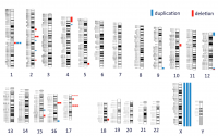 Depiction of genomic imbalances detected in patients with chronic kidney disease. The human chromosomes are shown (numbered). The colored bars represent the pathogenic genomic deletions (red) and duplications (blue) detected in a patient. In total, the study identified 21 different genetic lesions in 31 patients, indicating that most patients had a unique genomic pathology. The size of each bar is proportional to the size of the genomic lesion. (Credit: Dr. Ali Gharavi)