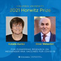 NEW YORK, NY (August 16, 2021)—Columbia will award the 2021 Louisa Gross Horwitz Prize to Katalin Karikó, PhD, and Drew Weissman, MD, PhD, for trailblazing work on messenger RNA (mRNA) vaccines for COVID-19. The prize will be presented at a ceremony on January 5, 2022.