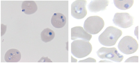 Perplexing results from antimalarial assays led Jennifer Small-Saunders to discover how the malaria parasite uses an ancient epitranscriptomic mechanism to hide from today's antimalarial drugs. Malaria parasites killed by artemisinin appears as dots inside red blood cells; resistant parasites that survive treatment appear as little rings (right photo). Images provided by Jennifer Small-Saunders.