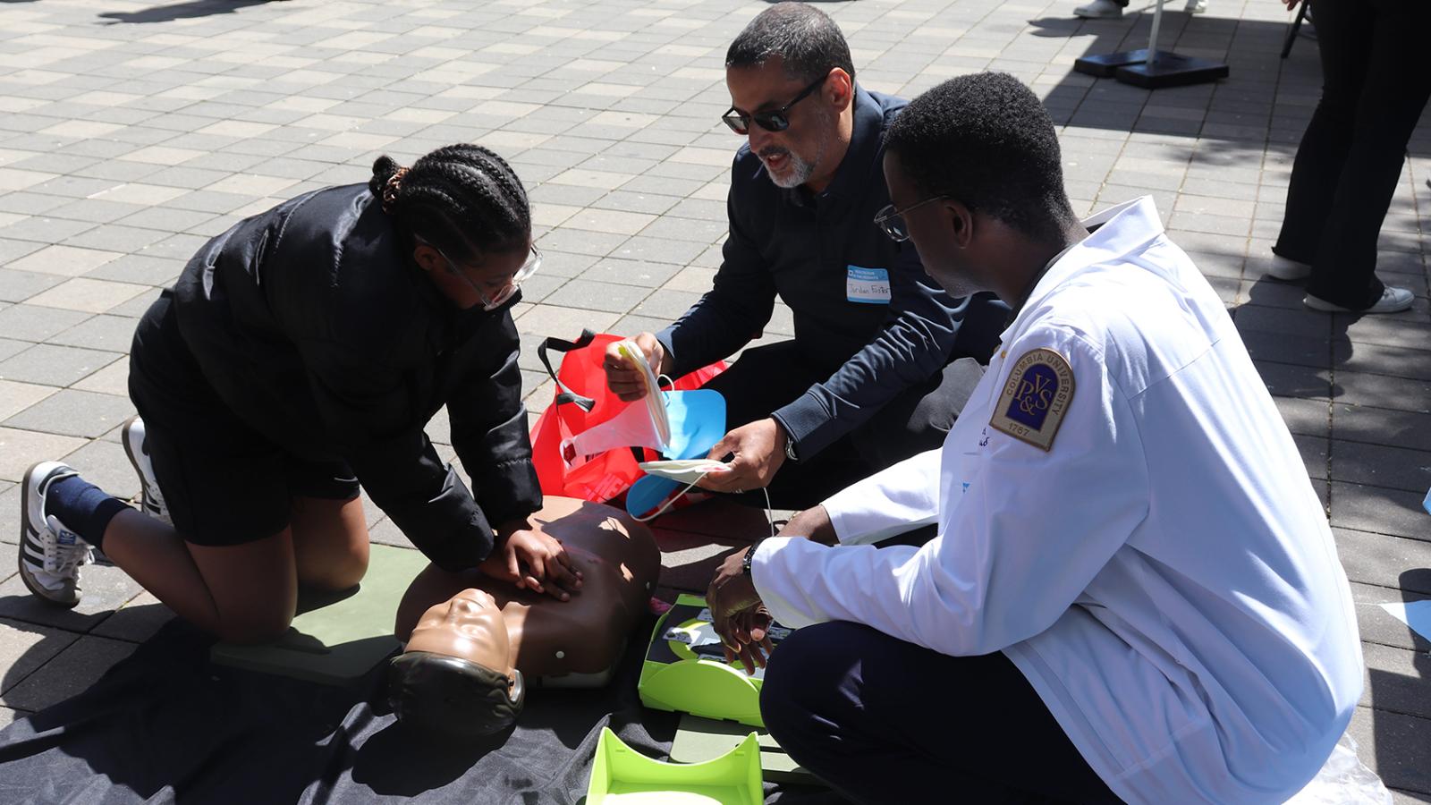 Community members were offered essential health screenings for hypertension, diabetes, and kidney and liver health. Culturally competent health education focused on nutrition, disease prevention, and wellness, and participants were connected to local services for follow-up care. Training in hands-only CPR and AED use, led by Columbia students and faculty, equipped dozens of community members with life-saving skills. There was also training on Narcan use and how to stop life-threatening bleeding. In addition, community-based organizations were on hand to provide connections to community resources and support services. The day also included fun activities like Zumba demonstrations and raffles.