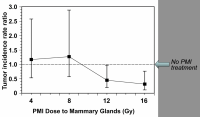 The current study tested this hypothesis by performing PMI on transgenic mice that have a high risk of developing breast cancer, simulating the unaffected breast of a breast cancer survivor. Lead shields were positioned so that one side of each mouse was shielded from the radiation. As predicted, a moderate dose of radiation reduced the breast cancer risk in the treated side by a factor of about 3.