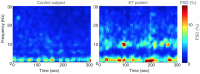 A new study suggests that patients with essential tremor have unusual brain waves in the cerebellum that cause the tremors (the same brain waves in mice produce tremor). The left image show a cerebellar EEG in a control subject; the right image shows the additional brain waves in a patient. Highest intensity is colored in red, lowest intensity in blue.