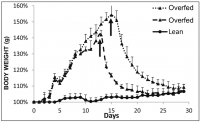 In two weeks, the mice gained 50 percent of their body weight (which is equivalent to a 150-pound person gaining five pounds a day for two weeks). After the tube-feeding stopped—and the mice had free access to food—their weight rapidly dropped and returned to their previous weight within a couple of weeks.