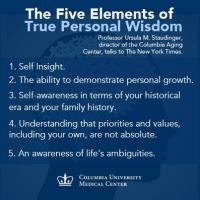[In a New York Times article by Phyllis Korkki ], Ursula Staundinger makes a distinction between general wisdom (understanding life from an observer’s perspective) and personal wisdom (insight into one’s own life). Her model of personal wisdom includes five elements (e.g., self-insight, awareness of life’s ambiguities). Professor Staudinger’s studies have shown that wisdom in this sense is rarely found in people. Also, wisdom actually declines in the final decades. While many people tend to develop a coping strategy in old age and look back on their lives in a more positive light, a wise person in contrast would acknowledge failures and losses, and still try to improve.